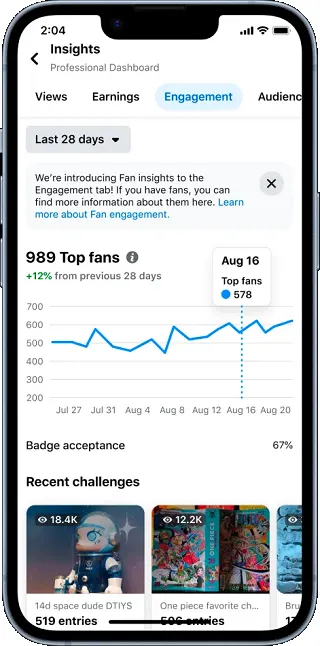 “Fan challenges enable an easy but powerful way to connect with your community over a shared moment or topic that matters to you. Invite your fans into the creative process by setting a prompt and empowering your fans to create and share content with you and each other.”