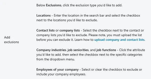 That said, you can also implement exclusions to further refine your targeting, with some broad-ranging parameters to help guide LinkedIn’s targeting tools: