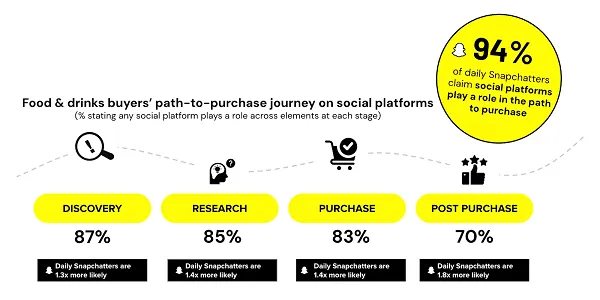 As you can see, 94% of Snapchatters say that social media plays a role in their purchase activity, while social apps, in general, play a big role in boosting awareness of food products.