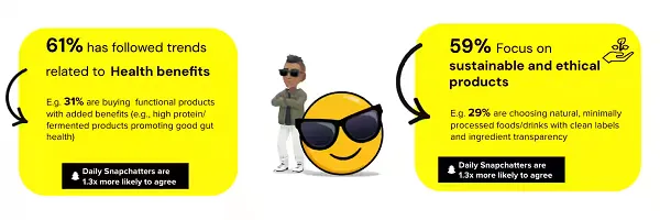 “A huge 67% of consumers say they trust creator recommendations about food or drink products, resulting in 74% of consumers saying they are likely to trial a new food/drink launch that has been promoted or endorsed by a creator. Daily Snapchatters are 1.5x more likely to agree with this compared to non-Snapchatters.”