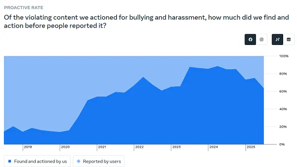 Which is also reflected in the data. For example, in its reporting on "Bullying and Harassment," the rate of proactive detection from Meta's systems, versus reports submitted by users, has declined significantly in the last thee quarters.