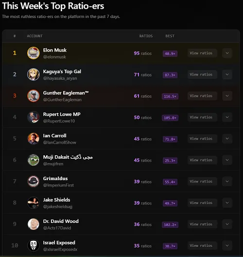 There’s also a listing of top “ratio-ers,” or the people who regularly post replies that get more likes than the original post.