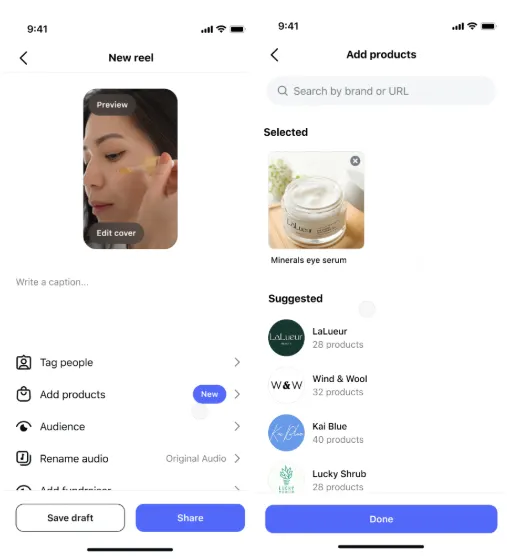 Meta’s also adding product links in Reels, which can be actioned by linking to a brand’s catalog (already uploaded to Meta), or via URL.