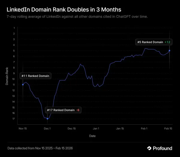 LinkedIn was also among the leading AI chatbot sources in another study, published by data tracking platform Profound, which looked at the top AI answer sources between November 2025 and February 2026.