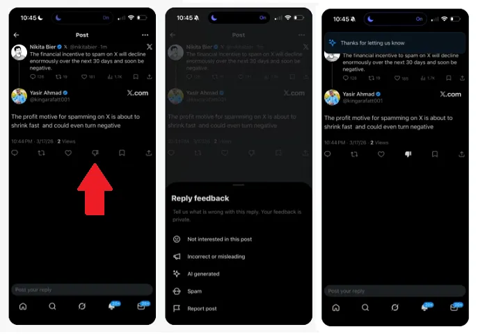 X’s head of product Nikita Bier shared a preview of the feature in an X post on Wednesday, with a new thumbs-down icon added to the lower function bar on post replies.