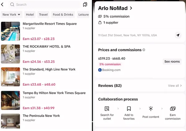 Tapping on the “TikTok Go” option will take you through to a listing of hotels, which will also display how much creators can earn from commissions for posting content about that provider.