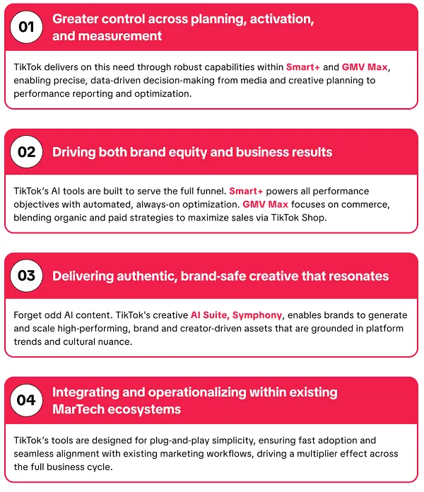 These secondary tips are TikTok-specific, providing more direct insight into how TikTok’s AI-powered ad tools can assist in driving better results, using elements like its Smart+ ads and its Symphony creative tools.