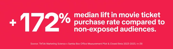 TikTok reported that across the campaigns measured, “TikTok exposure drove a median +172% lift in movie ticket purchase rate compared to non-exposed audiences.”