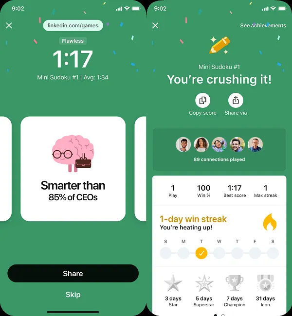 LinkedIn says that 86% of its members who play its puzzle games return to try again the next day, with 82% still playing a week later.