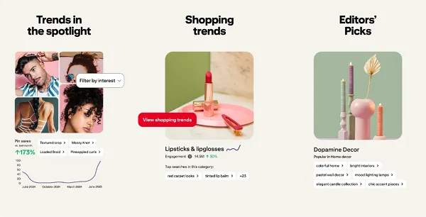 - Editors’ Picks - Delivers data-backed, cultural trends resonating with users that are hand-curated by Pinterest Editors. Brands can respond to cultural moments by turning these trends into standout campaigns through Editorial Sponsorship.