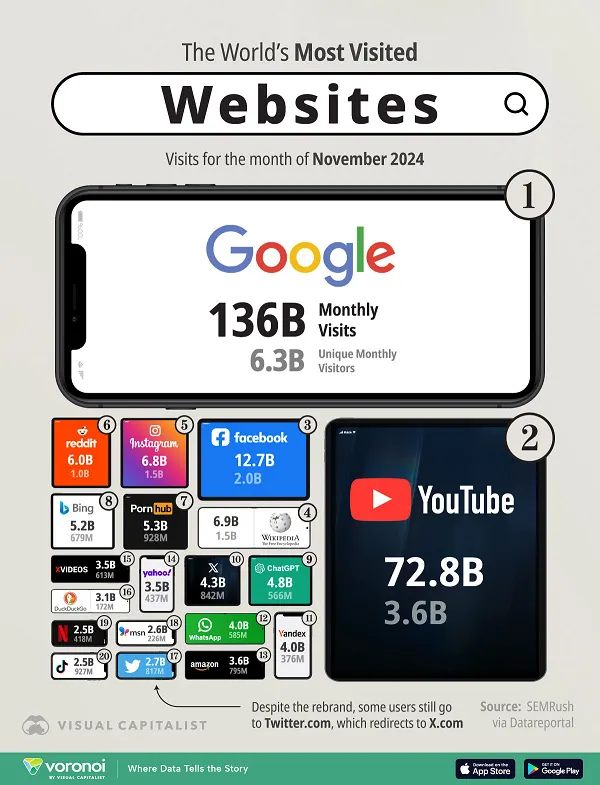 The below infographic from Visual Capitalist displays the most visited websites in the world as of November 2024, underlining some interesting web usage trends.