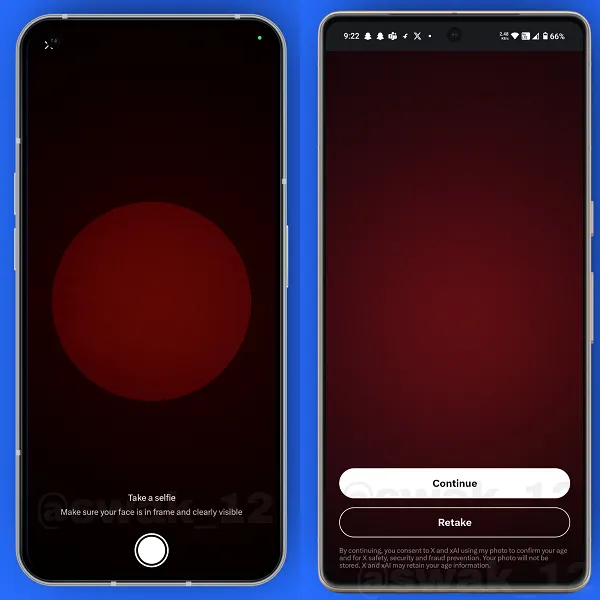 As you can see in these example screens, posted by @swak_12 (and X Daily News), X is building a native selfie process for its age checks, in which it also notes that X and xAI will use your selfie image for age checking.
