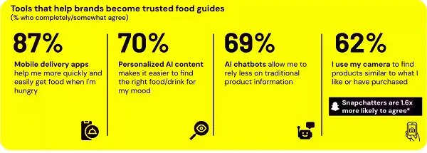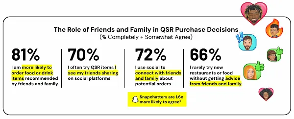 “Whether they’re deciding on what to eat or keeping up with the latest food trends, many consumers use social to start their food purchase journey because all the info is already at their fingertips. In fact, 76% agree seeing tasty-looking items on social media prompts them to order food. Snapchatters in particular are 2.7x more likely to make QSR-related purchases by using links provided by a brand on social.”