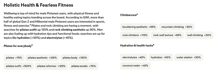Each trend includes a brief summary, and a breakdown of the key topics of focus among Pinterest users.