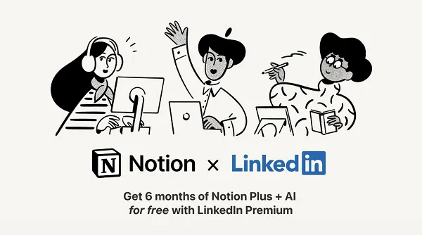 “LinkedIn and Notion have partnered to bring you a smarter way to work and grow. LinkedIn Premium subscribers can now enjoy six months of free Notion Plus with AI for free. This offer is designed to empower professionals with tools to write, plan, and organize their work in Notion while unlocking new career opportunities through LinkedIn.”