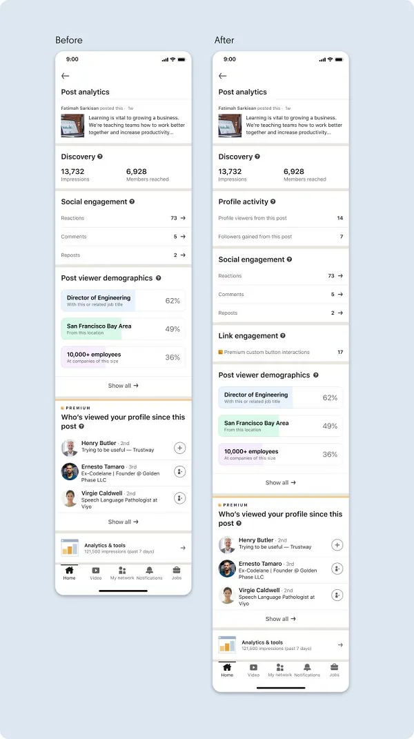 LinkedIn also added additional metrics for users back in May, including profile viewers from a post, followers gained from a post, and Premium custom button clicks.