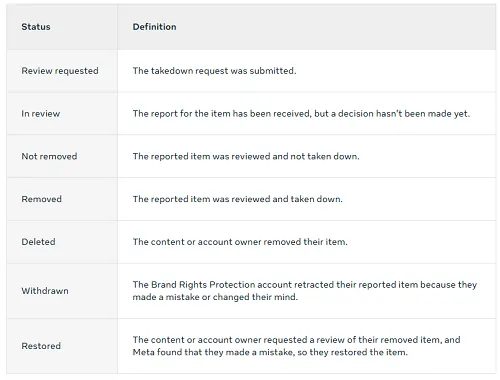 Which seems like it doesn’t quite fit in Brand Rights Protection manager, but it’s a related element, which Meta has incorporated into the reporting flow, in order to use the broader industry knowledge of rights holders to investigate such violations.
