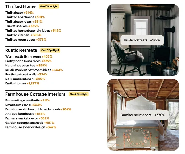 According to Pinterest, it’s a rural renaissance, with users increasingly searching for things like farmhouse cottages, thrifted décor and rustic retreats: