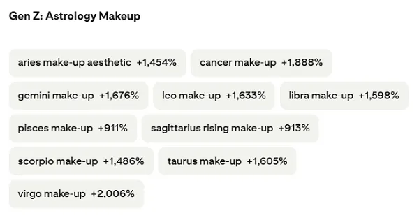 Pinterest also reports that “cool-toned beauty” has been getting attention, as has “Astrology make-up.”