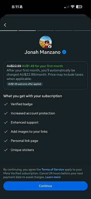 As you can see in this example, posted by Jonah Manzano, Meta’s looking to entice a few more Verified sign-ups through a big discount on the initial few weeks (note: dollars here are in AUD).