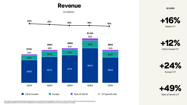 In terms of revenue, Pinterest brought in $855 million in Q1, up 16% year-over-year.