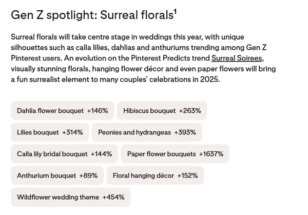 So if you’re planning your nuptials in 2025, you may want to take a look, while if you’re a marketer in a related field, these trend notes could help you highlight more relevant products for your promotions.