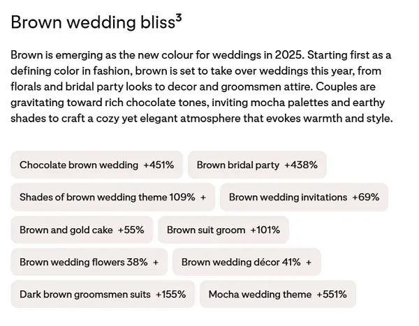 Pinterest’s full wedding trends overview highlights nine emerging trends, including brown-themed weddings: