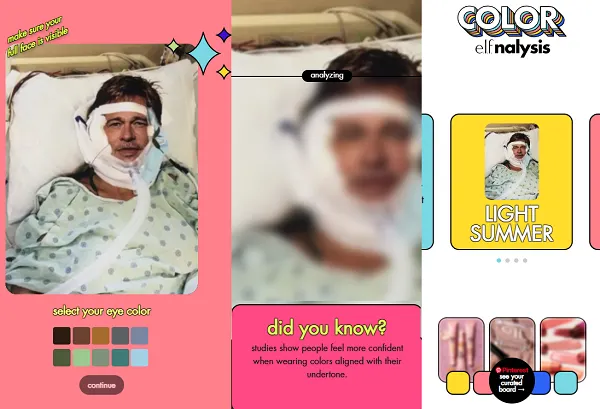 As you can see in these examples, using the “e.l.f.nalysis” activation, you can either upload a selfie or a photo from your camera roll (I’ve nominated Mr. Pitt in my place), along with a manual tag fr your eye color, which will then be analysed to highlight your best color palette.
