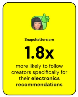 “75% of Snapchat users agree that they consider creator recommendations on social as trustworthy as those from friends and family, which is 1.8x greater than non-Snapchatters. In fact, 81% follow creators specifically for their electronics recommendations.”