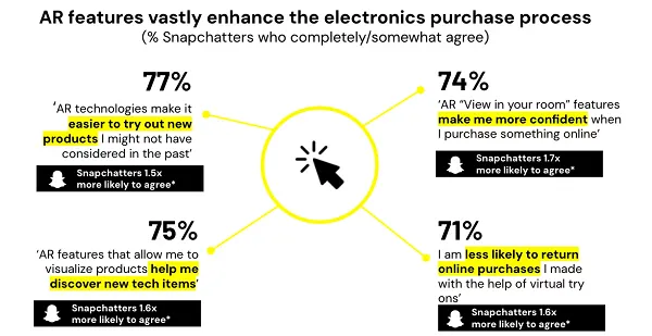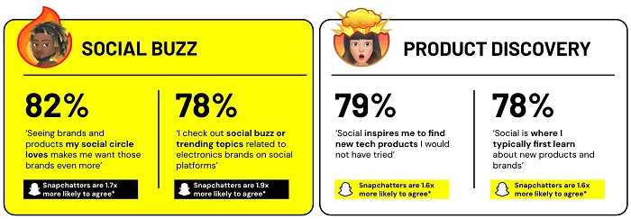 “From viral product drops to creator reviews, social platforms are a major catalyst in consumer electronics discovery. 78% of Snapchatters say social is where they typically first learn about new products and brands, which is 1.6x greater than non-Snapchatters.”