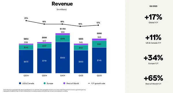 In terms of revenue, Pinterest brought in $998 million for the quarter, a 17% increase on the same period last year.