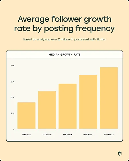 Indeed, Buffer says that accounts that post 3-5 times weekly see around a 12% average reach boost per post, while posting 10x per week increases that to 24%.