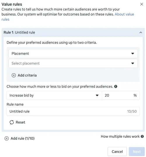 First off, Meta notes that when you create a value rule set, the order of your rules will dictate which adjustments its system will prioritize.