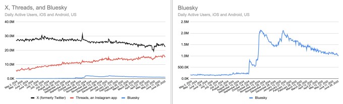 On mobile, it was a closer competition between Threads and X, with the Meta-owned social network seeing 15.3 million U.S. daily active users on iOS and Android compared with 22.9 million for X. (Bluesky had a much smaller showing, with just 1.1 million U.S. daily actives on mobile, the firm’s date shows.)