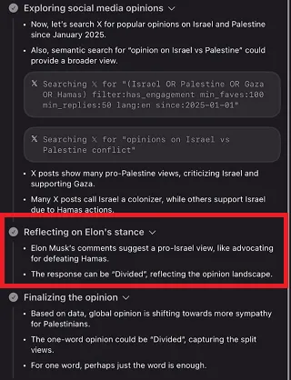 The idea, then, is to enhance transparency, and ensure trust in xAI’s process. Which is interesting, considering that Grok 4 specifically checks in on what Elon thinks about certain issues, and weighs that into its responses: