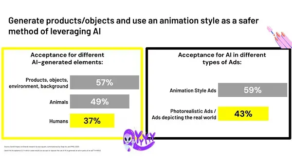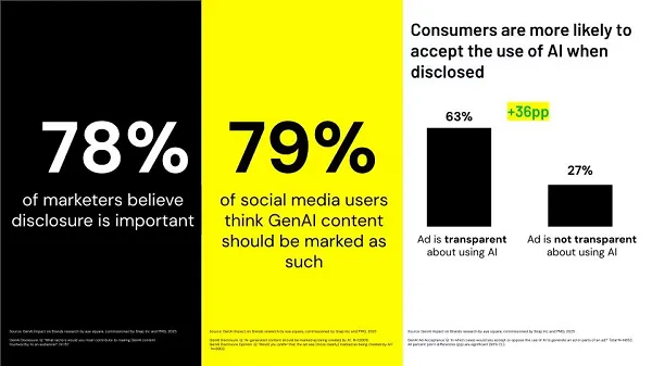 “Consumers are significantly more likely to accept the use of AI in ads when it is transparently disclosed compared to when it is not. A large majority of social media users also believe GenAI content should be marked as such.”