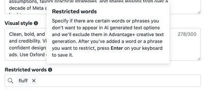 So if there are any words or descriptors that you don’t think fit your brand, for whatever reason, you can now tell Meta’s system not to use them when it comes up with alternate variations of your ad text.