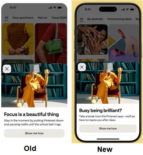 “Teens in Canada and the United States welcomed the feature, but said the messages read like they were coming from a parent or a teacher. To give the prompt a peer-to-peer tone, Pinterest updated the language to be more casual and relatable through phrases such as “busy being brilliant?” and “take a break”.”