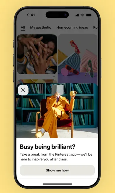 As you can see in this example, Pinterest’s teen usage prompts aim to get students to rethink how they’re using social apps, including Pinterest, during school times.