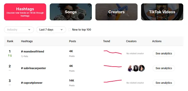 TikTok’s trends tool, which provides insights into trending hashtags by industry, is a valuable option for digging into such, and gleaning important notes to help guide your creative thinking.