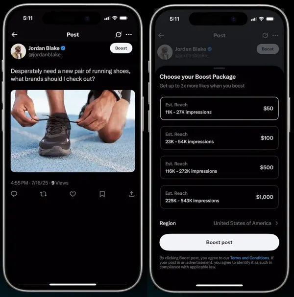 As you can see in these example screens, X is rolling out a new “Boost” button on your posts, which, when tapped, will give you a range of options to amplify your update.