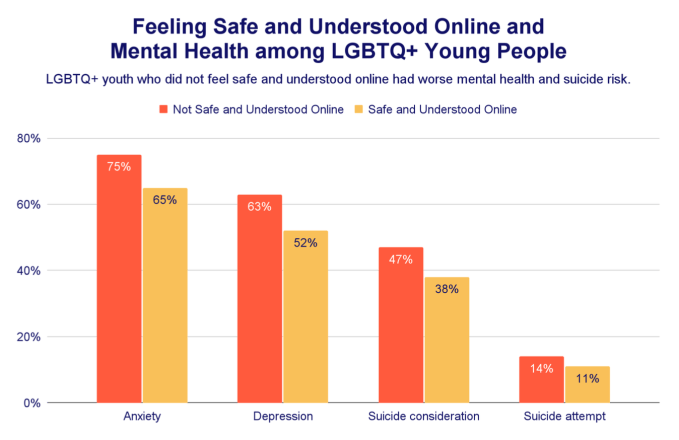 When LGBTQ+ youth do not feel safe or accepted in their daily lives, they turn to the internet to seek community. Two new studies, conducted by The Trevor Project and Hopelab/Born This Way Foundation, each found that young LGBTQ+ people report greater rates of depression, anxiety, and suicidal ideation or attempts when they do not have access to safe online communities.