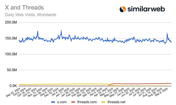 As you can see in this chart, X sees a lot more web visits than Threads, though the chart itself is indicative of the potential discrepancies in Similarweb data.