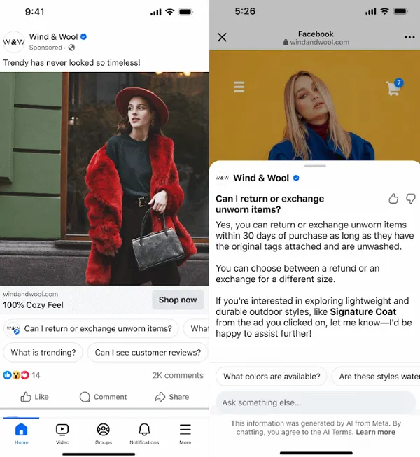As you can see in this example, once you’ve set up a chatbot, people who view your ads on Facebook and IG will be able to tap the queries at the bottom of the ad, which will take them through to a response from the bot on your site.