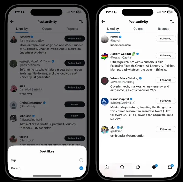 As you can see in this example, in the latest version of the X app, you can now go to “View Activity” at the bottom right of the expanded post display, then tap on the “Liked by” listing to see who’s liked your post. Within that, you can then select the new up/down arrow icon at the top right of screen to sort your post like display by “Top” or “Recent.”