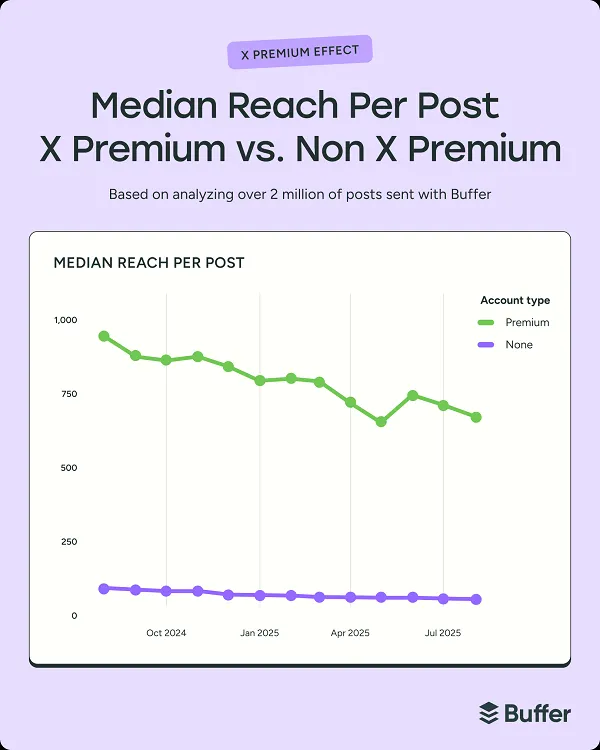 According to Buffer’s data, people paying for the most basic X Premium tier (Basic) generally get fewer than 100 impressions per post, while Premium accounts get 600 impressions, on average.