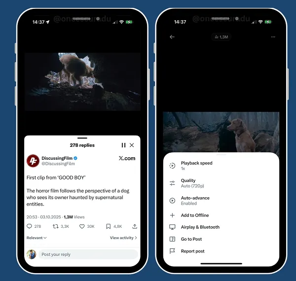 As you can see in this example, posted by app researcher Radu Oncescu, X has got a new design for the interaction display on videos within its dedicated video tab, which puts more focus on the playback controls at the bottom of the screen.