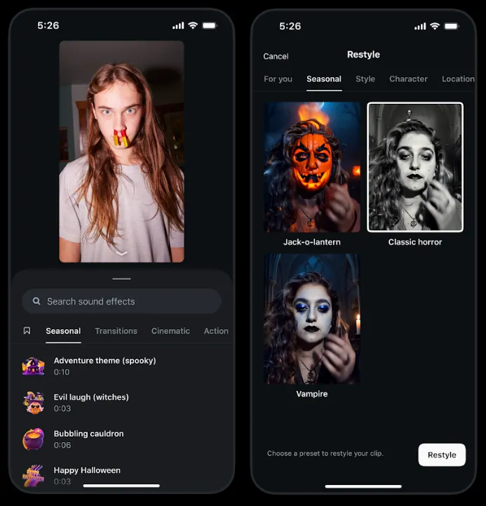 Edits is also getting new seasonal filters and restyle effects, as well as Halloween-themed sound effects, like “Bubbling cauldron” and “Adventure theme (spooky)”.