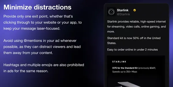 And in line with its updated Ad Quality guidelines, X says that advertisers should minimize distractions within their promotions, in order to maintain focus on the main objective.