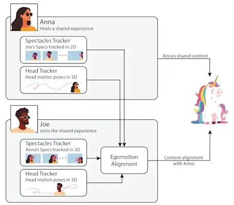 “The algorithm operates by tracking nearby Spectacles and then comparing the motion data other devices sense against its own tracked movement patterns. A robust optimizer finds the 6DoF pose (position and orientation) that aligns both virtual worlds so that shared virtual objects appear accurately in the same physical location for all connected users.”